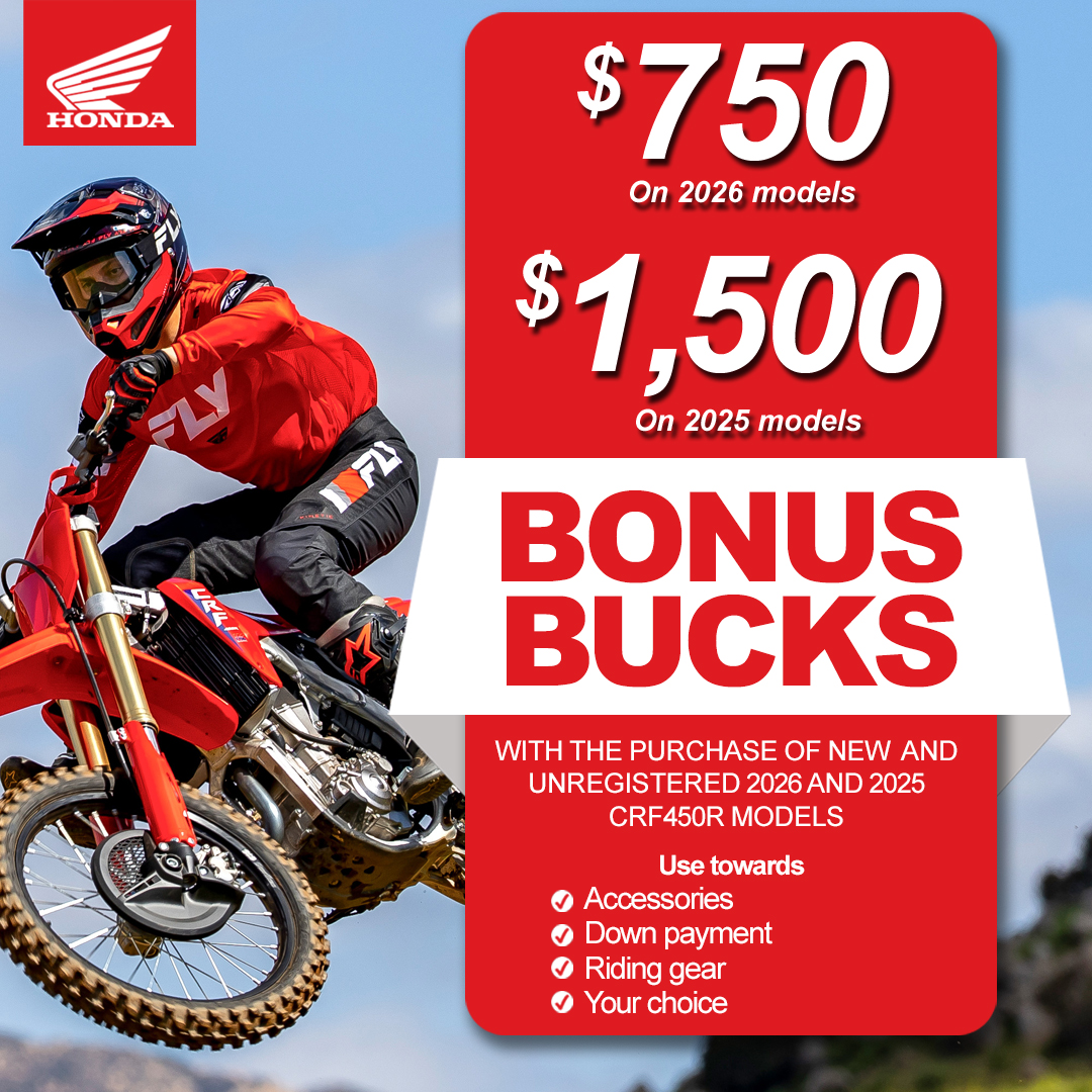 $750 on 2026 Models - $1,500 on 2025 Models - Bonus Bucks CRF450R MODELS